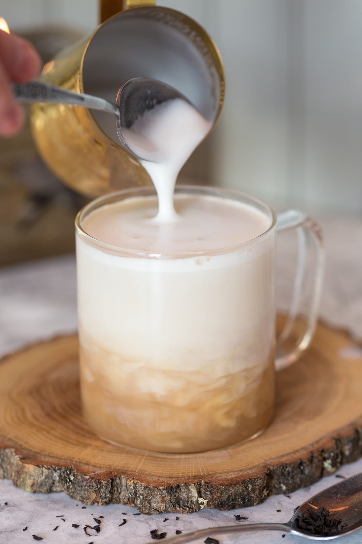 - Steam the milk and pour it into the tea over a spoon to create layers. Serve immediately.