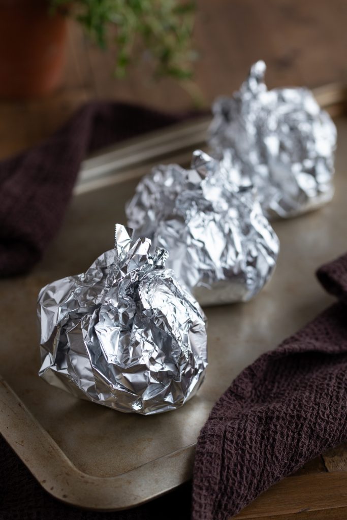Cut off as many tinfoil sheets as you have peppers, in this case 3. Place a bell pepper in the centre of each foil and lay them on an oven tray. Lightly crumple the sheets bending the edges upwards. This is to catch any potential leakage from the peppers and keep the oven tray clean.